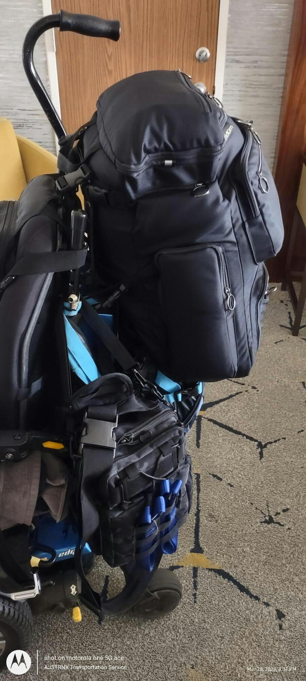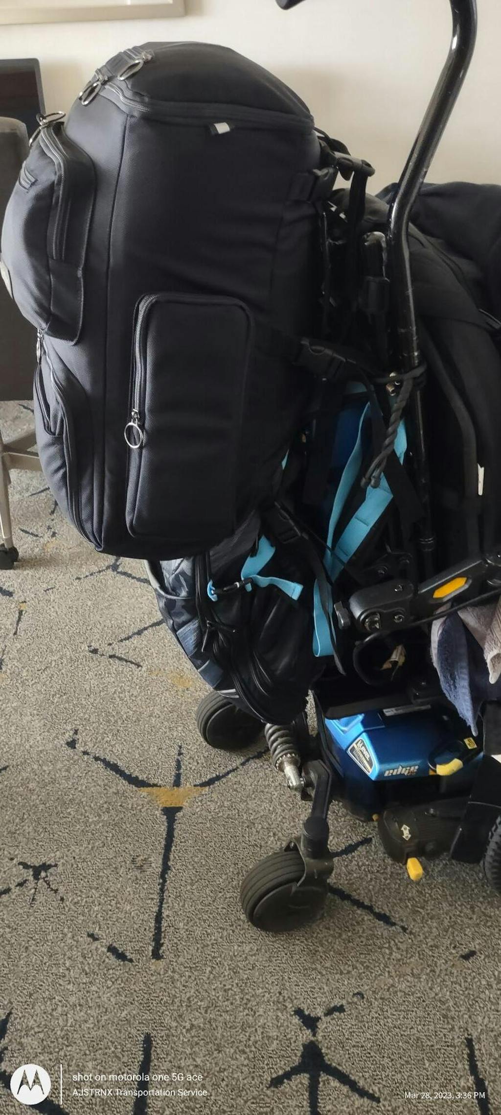 My backpack contains my laptop, Roku, a couple of power banks, my credentials and important documents in a portfolio, power cords and connectors, and my blood pressure device. I will need to rethink how I will pack my personal toiletries bag and the power charger for my Power Wheelchair to keep everything within the 2 bags as carry-ons when flying. The bag on the side is what I'm using for the power charger for my Power Wheelchair.